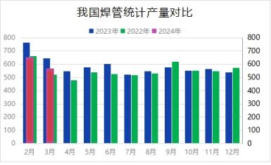 3月宏觀政策未超預期,鋼市呈現(xiàn)兩次弱勢探底行情;同時重要會議召開后北方連發(fā)兩周環(huán)保限產(chǎn)預警,部分架子管廠、鍍鋅管廠、鍍鋅加工廠等收到停產(chǎn)通知,放慢產(chǎn)能水平提升節(jié)奏。國家統(tǒng)計局統(tǒng)計數(shù)據(jù)顯示,2024年3月份,我國焊接無縫鋼管產(chǎn)量567.3萬噸,同比下降3.5%;1-3月份我國焊接無縫鋼管產(chǎn)量1192.5萬噸,同比下降5.6%。
