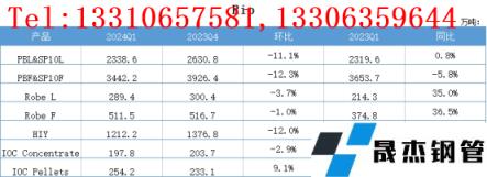 PBL&SP10L第一季度產(chǎn)量2338.6萬噸,環(huán)比下降11.1%,同比上升0.8%;PBF&SP10F第一季度產(chǎn)量3442.2萬噸,環(huán)比下降12.3%,同比下降5.8%;Robe L第一季度產(chǎn)量289.4萬噸,環(huán)比下降3.7%,同比上升35.0%;Robe F第一季度產(chǎn)量511.5萬噸,環(huán)比下降1.0%,同比上升36.5%;HIY第一季度產(chǎn)量1212.2萬噸,環(huán)比下降12.0%,同比下降11.3%;IOC Concentrate第一季度產(chǎn)量197.8萬噸,環(huán)比下降2.9%,同比下降6.4%;IOC Pellets第一季度產(chǎn)量254.2萬噸,環(huán)比上升9.1%,同比上升16.1%。