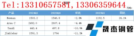 2024年第一季度,Rio鐵礦石總產(chǎn)量8238.8萬噸,環(huán)比下降10.6%,同比下降1.4。