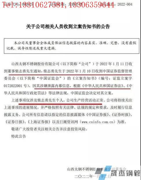 根據1月12日晚間,太鋼不銹發(fā)布的公告,公司董事柴志勇先生于2022年1月10日收到中國證券監(jiān)督管理委員會的《立案告知書》(編號:證監(jiān)立案字0172022001號),因其涉嫌泄露內幕信息,根據《中華人民共和國證券法》、《中華人民共和國行政處罰法》等法律法規(guī),中國證監(jiān)會決定對其立案。