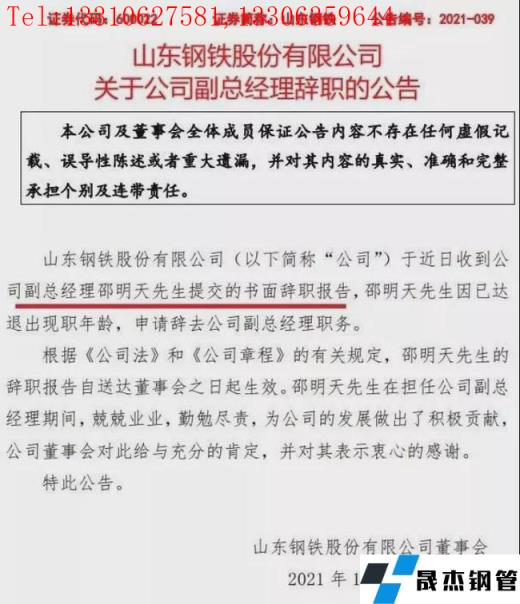 12月1日,山東鋼鐵發(fā)布公告稱,于近日收到公司副總經(jīng)理邵明天先生提交的書面辭職報(bào)告。邵明天先生因已達(dá)退出現(xiàn)職年齡,申請辭去公司副總經(jīng)理職務(wù)。