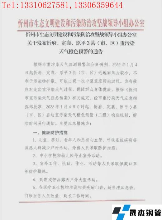 根據(jù)忻州市重污染天氣監(jiān)測(cè)預(yù)警組會(huì)商研判,2022年1月4日0時(shí)起 ,忻府、定襄、原平3縣(市、區(qū))啟動(dòng)重污染天氣橙色預(yù)警(二級(jí))響應(yīng)機(jī)制,解除時(shí)間另行通知。相關(guān)強(qiáng)制性污染減排措施為: