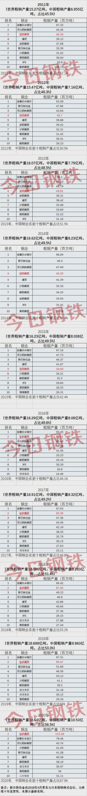 看到這樣的一份成績(jī)單,筆者也是深受震撼!為了能夠呈現(xiàn)中國(guó)寶武(前身寶武集團(tuán))的階段性跨越發(fā)展,筆者選取了世界鋼鐵協(xié)會(huì)2011至2020年前十位鋼企粗鋼產(chǎn)量進(jìn)行了匯總(僅作為分析示意使用,未參考其他渠道或機(jī)構(gòu)相關(guān)排行和產(chǎn)量數(shù)據(jù))。通過(guò)透視十年間的粗鋼產(chǎn)量演變發(fā)展數(shù)據(jù),對(duì)中國(guó)寶武(前身寶鋼集團(tuán))的十年發(fā)展歷史進(jìn)行了回顧!這是一段中國(guó)鋼鐵業(yè)趕超發(fā)展的歷史,也是中國(guó)寶武從前列到峰巔的記錄!