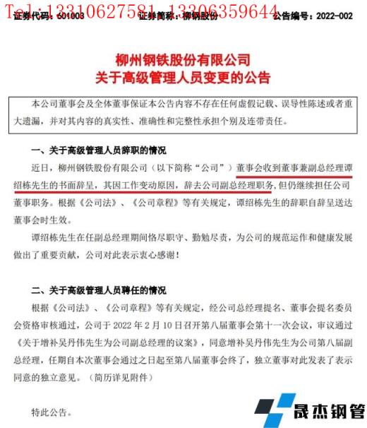 2月10日,柳州鋼鐵股份有限公司發(fā)布關(guān)于高級管理人員變更的公告。公告顯示,柳鋼股份董事會(huì)收到董事兼副總經(jīng)理譚紹棟的書面辭呈,其因工作變動(dòng)原因,辭去柳鋼股份副總經(jīng)理職務(wù),但仍繼續(xù)擔(dān)任柳鋼股份董事職務(wù)。