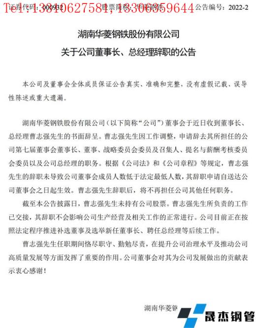 華菱鋼鐵董事長、總經(jīng)理辭職