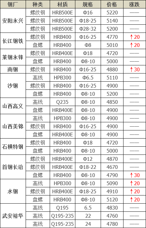 據(jù)數(shù)據(jù)顯示今日共26家鋼廠調價,其中: