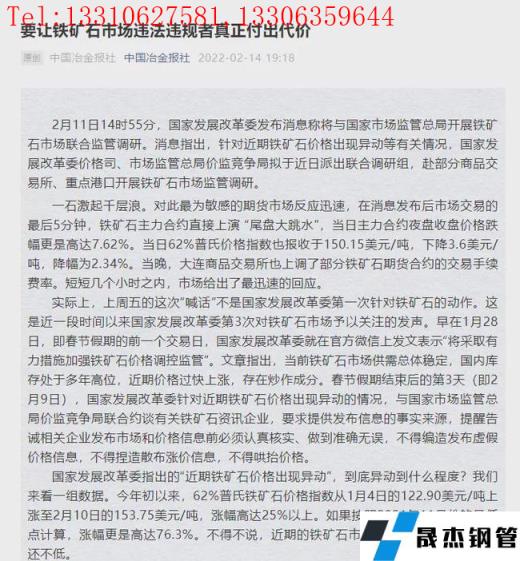 2月14日,中鋼協(xié)官微發(fā)布《要讓鐵礦石市場違法違規(guī)者真正付出代價》的文章,文章措辭嚴厲,強勢打壓。文章指出:我們有理由相信,國家發(fā)展改革委此次的一系列行動,必然會讓違法違規(guī)的投機鉆營者真正付出代價。我們期待,鐵礦石市場自此回歸理性。