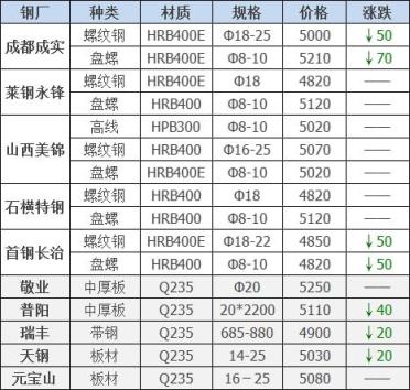 下調(diào)5家,占比50%,調(diào)價幅度20-70元/噸;