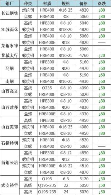 下調(diào)8家,占比80%,調(diào)價(jià)幅度30-80元/噸;