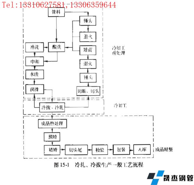 盡管冷加工管的規(guī)格范圍、尺寸精度、表面質(zhì)量和組織性能均比熱軋優(yōu)異,但其生產(chǎn)中存在四個(gè)方面的問(wèn)題: 循環(huán)次數(shù)多、生產(chǎn)周期長(zhǎng)、金屬消耗大、中間處理過(guò)程復(fù)雜,圖151 是碳鋼管和合金鋼管的冷軋、冷拔生產(chǎn)的一般工藝流程圖。各種鋼管由于其材質(zhì)、技術(shù)條件、規(guī)格不同,其生產(chǎn)工藝流程及工藝制度也有所不同,但總的來(lái)說(shuō)由下列主要工序組成:
