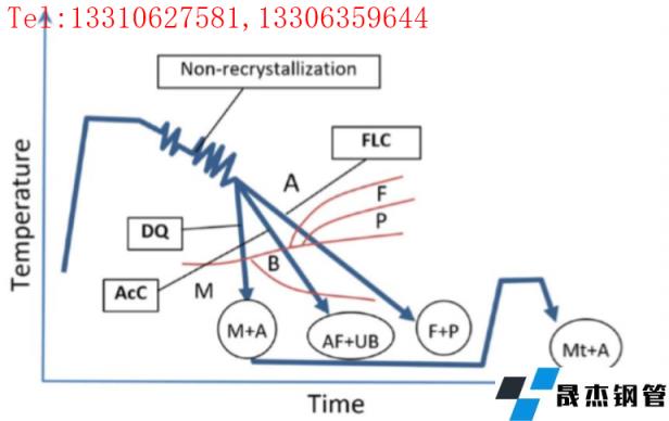 自1980年世界上第一臺在線加速冷卻裝置應(yīng)用于大工業(yè)生產(chǎn)的鋼板軋機(jī)以來,[1]熱機(jī)控軋控冷技術(shù)經(jīng)歷了三代創(chuàng)新;快速層流冷卻(FLC),加速冷卻(AcC)和直接淬火(DQ)與在線回火,[2]如圖1所示。控制軋制技術(shù)主要通過細(xì)化鐵素體晶粒組織來提高韌性,[3]然而,TMCP通過奧氏體轉(zhuǎn)變?yōu)獒槧铊F素體和貝氏體轉(zhuǎn)變而獲得帶鋼的高強(qiáng)度,并增強(qiáng)了韌性。