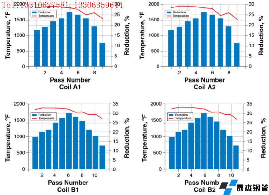 在加熱爐經(jīng)過1.5小時加熱到1700℉,圖7顯示了每道次的壓下率和溫度,從圖可以看出,相同成分的鋼卷呈現(xiàn)出相同的溫度模式,因此,它們在Steckel軋機(jī)出口處的奧氏體晶粒尺寸非常接近。