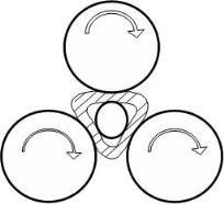 阿塞爾軋管機(jī)(ASSEL Mill)的三個軋輥在機(jī)架中呈120度角布置,與長芯棒構(gòu)成一個相對封閉的環(huán)狀孔型。軋輥軸線相對于軋制中心線垂直方向和水平方向均傾斜于一定角度,分別叫喂入角和輾軋角。軋輥形狀呈錐形,中間段有一個凸起叫做輥肩,軋制時與長芯棒完成集中變形,實現(xiàn)較大的壓下量,延伸系數(shù)可達(dá)2左右。