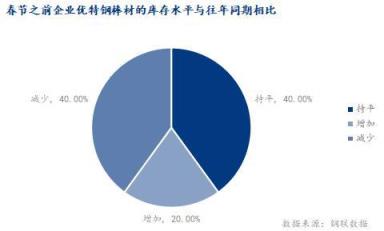 根據(jù)調(diào)研,春節(jié)之前企業(yè)優(yōu)特鋼棒材的庫(kù)存水平與往年同期相比近40%同比持平,40%無縫鋼管廠庫(kù)存同比下降,僅少數(shù)庫(kù)存有增加。預(yù)計(jì)春節(jié)后庫(kù)存累計(jì)情況與往年相比,四成為持平,四成為減少,兩成為增加。主要原因是目前來看,庫(kù)存的減少,導(dǎo)致資源的緊缺,貿(mào)易商會(huì)向廠家拿貨,無縫鋼管廠降庫(kù)會(huì)加快。