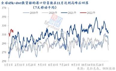 根據(jù)調(diào)研,10月份全球鐵礦石發(fā)運出現(xiàn)了大幅下降,10月環(huán)比降幅達5.8%至1.33億噸,傳導(dǎo)至12月中國海運鐵礦石進口環(huán)比下滑18%,至8500萬噸左右,同比下降11%,至近19個月低點。盡管12月鐵礦石發(fā)運回暖,但是由于10月以及11月運輸需求的下滑,多余運力需要被消化:太平洋板塊率先開始持續(xù)傳導(dǎo)下行壓力,致使租金價格下跌;西澳大利亞至中國C5航線運費于12月10日出現(xiàn)大幅下跌,跨太平洋C10航線也于當(dāng)周緊跟下行趨勢。市場上租家也看空海岬型船海運市場:12月中國至巴西的C14空載航線同樣下跌。與此同時,圣誕節(jié)假期期間也導(dǎo)致了交易節(jié)奏放緩,此外,許多租家也都想盡可能規(guī)避卷土重來的新冠疫情及相關(guān)港口規(guī)定。往后進入2022年1月,國際干散貨海運市場正式步入淡季。