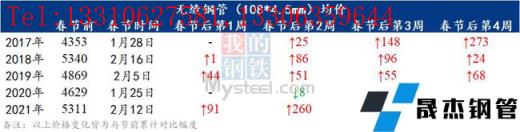 小編匯總近5年春節(jié)后四周無縫厚壁鋼管均價變化情況,以供參考。