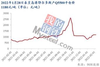 在印尼煤炭出口禁令助推市場(chǎng)看多情緒之下,去年12月觀望等待動(dòng)力煤港口價(jià)格下跌至700元/噸基準(zhǔn)價(jià)的下游采購(gòu)和貿(mào)易商一擁而上,紛紛加入搶購(gòu)大軍。不僅如此,由于今年節(jié)前補(bǔ)庫(kù)窗口期短、冬奧會(huì)電廠補(bǔ)庫(kù)和港口倒掛等利多因素發(fā)酵,秦港Q5500動(dòng)力煤價(jià)格一改12月加速下滑的頹勢(shì),在1月初開(kāi)始強(qiáng)力反彈,截至1月28日秦皇島港鄂爾多斯產(chǎn)Q5500動(dòng)力煤平倉(cāng)價(jià)1180元/噸,較上月底增長(zhǎng)47.5%,價(jià)格曲線也走出了深V趨勢(shì)。