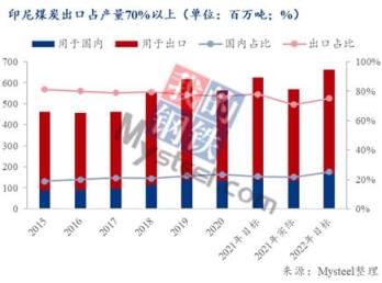 從2015年-2021年印尼煤炭產(chǎn)量結(jié)構(gòu)可以看出,用于國(guó)內(nèi)的煤炭數(shù)量平均占總產(chǎn)量的25%左右,而外部出口要占產(chǎn)量的四分之三,這也與印尼DMO中要求的煤礦應(yīng)將25%煤炭輸送國(guó)內(nèi)電廠基本一致。