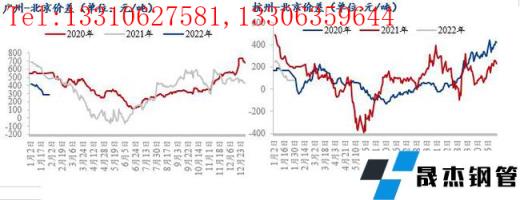 1月份廣州、杭州市場市場價格漲幅緩慢,北京市場價格漲幅居前,因此廣州-北京、杭州-北京市場的區(qū)域價差均有所收窄。目前廣州-北京價差在300元/噸左右,此價差略低于2020年、2021年同期水平,且結(jié)合無縫厚壁鋼管廠家的政策以及運(yùn)費(fèi)來看此價差也不足以吸引北方區(qū)域資源南下廣州。目前杭州-北京價差不足100元/噸,因北京價格相對高位,加之東北區(qū)域節(jié)后需求啟動較晚,因此東北區(qū)域部分無縫厚壁鋼管廠家傾向于把資源投放至北京區(qū)域,其中西林、新?lián)徜撋踔劣诤v味加写税才拧?/p>