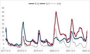 本周山東地區(qū)市場價格呈現(xiàn)盤整趨強的走勢,但市場成交弱勢,整體資源情況出現(xiàn)明顯變化。具體來看,本周山東各市場庫存情況如下: