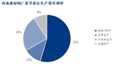 1、據(jù)調(diào)研顯示,西南地區(qū)33家建筑厚壁無縫鋼管生產(chǎn)企業(yè)中,春節(jié)期間有停產(chǎn)檢修計劃18家,占比54.55%,不飽和生產(chǎn)8家,占比24.24%,合計影響產(chǎn)量約235.75萬噸;另4家無縫厚壁鋼管廠家正常生產(chǎn),3家無縫厚壁鋼管廠家長期停產(chǎn)。