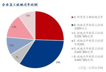 調(diào)研企業(yè)樣本中,所有員工都就地過(guò)年占比25.50%,就地過(guò)年的員工比例在80%以上占比33.70%,就地過(guò)年的員工比例在60%~80%之間占比13.75%,就地過(guò)年的員工比例在40%~60%之間占比9.76%,就地過(guò)年的員工比例在20%~40%之間占比7.10%,就地過(guò)年的員工比例不到20%占比10.20%。