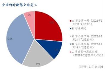 調(diào)研企業(yè)樣本中,對(duì)于全面復(fù)工的時(shí)間,節(jié)后第一周(2022年2月7日~2月13日)占比26.37%,節(jié)后第二周(2022年2月14日~2月20日)占比36.32%,節(jié)后第三周(2022年2月21日~2月27日)占比19.40%,節(jié)后第四周或以后(2022年2月28日及以后)占比6.47%,暫未確定占比11.44%。