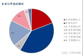 2、與去年同期相比,企業(yè)訂單增長(zhǎng)的占比49.89%,持平的占比39.25%,下滑的占比10.86%。企業(yè)訂單情況增長(zhǎng)的較多,形勢(shì)較為良好。