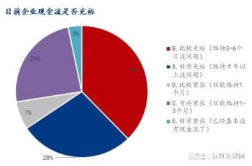 目前企業(yè)的現(xiàn)金流是否充裕,參與調(diào)研企業(yè)中表示比較充裕(維持3-6個(gè)月沒(méi)問(wèn)題)占比37.69%,非常充裕(維持半年以上沒(méi)問(wèn)題)占比27.94%,比較緊張(僅能維持1個(gè)月)占比6.87%,有些緊張(僅能維持1-3個(gè)月)占比24.17%,非常緊張(已經(jīng)基本沒(méi)有現(xiàn)金流了)占比3.33%。