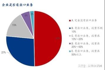 參與調(diào)研企業(yè)中,49.67%企業(yè)表示完全沒(méi)有出口業(yè)務(wù),50.33%企業(yè)有出口業(yè)務(wù),具體看有出口業(yè)務(wù),比重不到10%占比26.83%;有出口業(yè)務(wù),比重在10%~20%占比15.52%;有出口業(yè)務(wù),比重在20%~50%占比5.54%;有出口業(yè)務(wù),比重在50%以上占比2.44%。