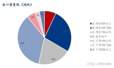 與去年同期相比,關(guān)于今年的出口量變化,在有出口業(yè)務(wù)的樣本中53.48%企業(yè)表示出口有增長(zhǎng),35.65%企業(yè)表示基本持平,10.87%企業(yè)出口下滑。具體來(lái)看增長(zhǎng)20%以上占比6.96%,增長(zhǎng)10%~20%占比26.52%,增長(zhǎng)10%以內(nèi)占比20.00%,基本持平占比35.65%,下滑10%以內(nèi)占比5.22%,下滑10%~20%占比2.61%,下滑20%以上占比3.04%。