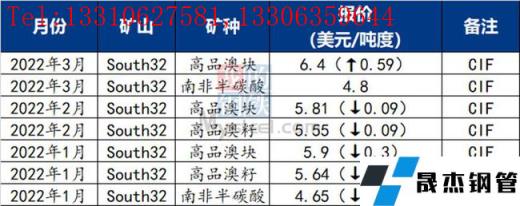 South32對華3月裝船報價:高品澳塊6.4美元/噸度(漲0.59),南非半碳酸4.8美元/噸度。