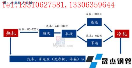 由于熱軋是冷軋的原料,調(diào)研了解有近40%的熱軋被用來生產(chǎn)冷軋,而且冷熱軋終端需求分布有部分重合,因此冷軋與熱軋價格走勢高度類似。冷軋板卷是以熱軋卷為原料,在室溫下經(jīng)過酸洗(費用80-120元/噸)、軋制(費用240-300元/噸),然后連退(費用300元/噸)或罩退(費用400元/噸)而成,冷軋成本較熱軋多出620-820元/噸。從下游需求分布來看,冷熱軋終端需求分布有部分重合,冷熱軋均被用于汽車、家電業(yè)(洗衣機、冰箱)以及產(chǎn)業(yè)設備等。