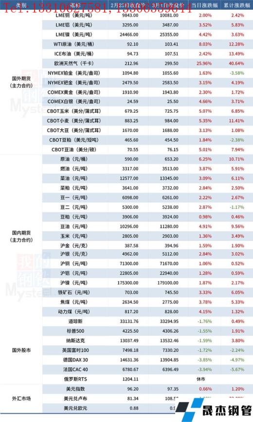 近期,受?chē)?guó)際局勢(shì)影響,全球金融及大宗商品市場(chǎng)出現(xiàn)較大波動(dòng)。3月1日,國(guó)際能源、農(nóng)產(chǎn)品、金屬價(jià)格仍大幅上漲,原油累漲超10%、歐洲天然氣累漲超40%。匯總情況如下: