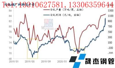 由于考慮到訂單、排產(chǎn)、后續(xù)市場情況等多種因素,無縫厚壁鋼管廠家生產(chǎn)計劃需提前制定,因此無縫厚壁鋼管廠家不會輕易減少產(chǎn)量。我們分析歷史情況發(fā)現(xiàn),在虧損較大后,冷軋產(chǎn)量才會有明顯的下降。由于2021年政策影響較大,我們選取2019-2020年冷軋無縫厚壁鋼管廠家的產(chǎn)量和利潤情況發(fā)現(xiàn),產(chǎn)量最低的兩個時間點分別為2019年5月底以及2020年5月底,這兩個時間點對應(yīng)的冷軋利潤也到達(dá)最低點,分別為-450元/噸和-279元/噸。