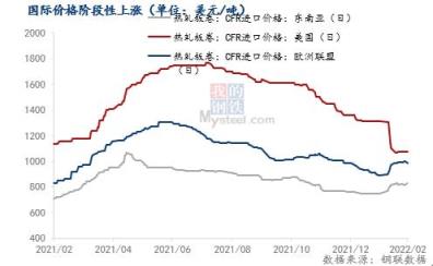 國際鋼價自俄烏沖突以來迎來了階段性上漲,截至2月28日,歐盟及東南亞進口CFR價格月環(huán)比分別上漲100美元/噸和82美元/噸,另外美國進口價格也在2月中下旬停止了下跌趨勢開始企穩(wěn)。