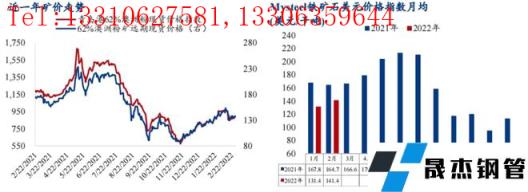 回顧2月鐵礦基本面情況,遠期供應端2月份全球鐵礦石發(fā)運量受到澳大利亞的泊位檢修和巴西的持續(xù)降雨影響下降,較1月減少2186萬噸至1.02億噸;近端供應由于前期發(fā)運偏低,2月份中國45鐵礦石到港量同步回落。需求方面,2月高爐鐵水產量在冬奧會期間嚴格限產的影響下先降后增,整體較1月下降。鐵礦石供需兩端雙降,但是供應降幅更大,供需差從1月的1200萬噸收窄至311萬噸,但仍不改供大于求的局面。體現到庫存端,2月港口庫存月環(huán)比累庫577萬噸,在港船舶減少了44條,因此2月鐵礦石基本面矛盾較小,對礦價并無支撐作用。此外,冬奧會限產嚴格疊加春節(jié)期間無縫厚壁鋼管廠家消耗自有庫存為主,無縫厚壁鋼管廠家需求低迷下礦價下行壓力較大,同時2月政府對價格監(jiān)管力度加強抑制部分投機需求,因此2月整體礦價震蕩下行。