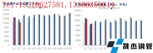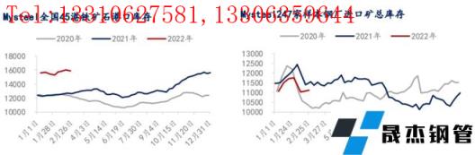 鐵礦石疏港:2月受限產限產影視,疏港大幅下降。截至2月25日,預計統(tǒng)計中國45港2月疏港量7364萬噸,日均疏港環(huán)比下降50.5萬噸/天至263萬噸/天,降幅16.1%。本月疏港降幅主要華北和華東地區(qū),一方面是由于春節(jié)期間無縫厚壁鋼管廠家消化廠內庫存為主,提貨需求下降,另一方面是由于部分港口冬奧會期間有環(huán)保限運措施,無縫厚壁鋼管廠家提貨受阻導致。3月來看,隨著無縫厚壁鋼管廠家復產和限運限產得相對放松,疏港逐漸恢復提高,3月疏港或能恢復到300-305萬噸/天。