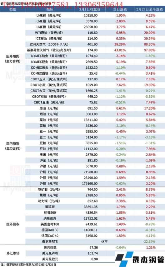 近期,受國(guó)際局勢(shì)影響,全球金融及大宗商品市場(chǎng)出現(xiàn)較大波動(dòng)。3月2日,多個(gè)大宗商品價(jià)格創(chuàng)多年新高,天然氣累計(jì)漲幅超80%,原油突破110美金。匯總情況如下: