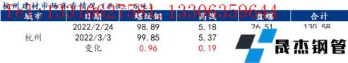 分品種來看,以杭州市場為例,本周杭州市場建筑厚壁無縫鋼管總庫存為130.25萬噸,其中螺紋鋼庫存99.85萬噸,周環(huán)比增加0.96萬噸,增幅為0.97%;盤螺25.03萬噸,周環(huán)比減少1.48萬噸,降幅為5.58%;線材5.37萬噸,周環(huán)比增加0.19萬噸,增幅為3.67%。