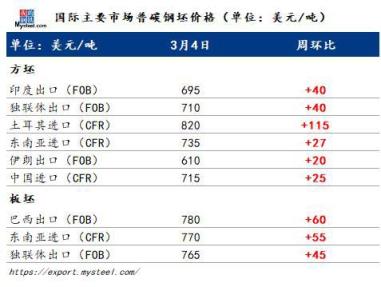 獨(dú)聯(lián)體鋼坯供應(yīng)短缺使得其歐洲買家積極采購?fù)炼滟Y源。土耳其方坯也在本周大幅上漲,據(jù)了解,今日土耳其方坯出口報(bào)價(jià)高達(dá)820美元/噸FOB,漲幅超過100美元/噸,土耳其無縫厚壁鋼管廠家對于鋼坯價(jià)格保持樂觀態(tài)度,部分無縫厚壁鋼管廠家轉(zhuǎn)向?qū)W⒂阡撆鞒隹?,而此前,土耳其主要出口螺紋鋼。從一家無縫厚壁鋼管廠家處了解到,目前市場交易積極,預(yù)計(jì)下周土耳其國內(nèi)價(jià)格會(huì)達(dá)到850美元/噸,而出口價(jià)格也會(huì)隨之上漲。