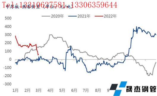2021年的唐山限產(chǎn)是從3月份開始的,那么在2021年3月份之前這段時間里,全國中板的周產(chǎn)量達到了歷史新高,平均每周產(chǎn)量在135-145萬噸,在唐山限產(chǎn)政策出臺過后,中板產(chǎn)量才開始出現(xiàn)了下滑。反觀今年,由于冬奧會限產(chǎn)及采暖季限產(chǎn),導致今年的限產(chǎn)其實是提前到了一月份,據(jù)我們統(tǒng)計的數(shù)據(jù)顯示,2022年1-2月份中板平均周產(chǎn)量在120-124萬噸,那這個產(chǎn)量水平相當于同比去年每周是減少了15-20萬噸,降幅是10-15%;從這方面來看,也能夠很好解釋,為什么今年春節(jié)前后,華北地區(qū)的價格上漲趨勢是又快又高,甚至高于華東地區(qū)價格,區(qū)域價差失衡。另一方面,從華東地區(qū)的調(diào)坯軋材無縫厚壁鋼管廠家春節(jié)期間檢修情況來看,今年的檢修時長明顯是比去年有延長,去年春節(jié)期間各調(diào)坯廠平均檢修時長是7天,今年部分無縫厚壁鋼管廠家受疫情原因影響,檢修時長延長至9-20天,也是進一步導致華東地區(qū)普板資源緊俏的原因。