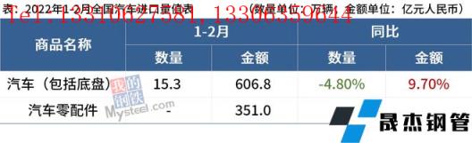 海關(guān)總署2022年3月7日數(shù)據(jù)顯示,2022年1-2月中國出口汽車47.7萬輛,同比增長69.70%。1-2月中國進(jìn)口汽車15.3萬輛,同比下降4.80%。