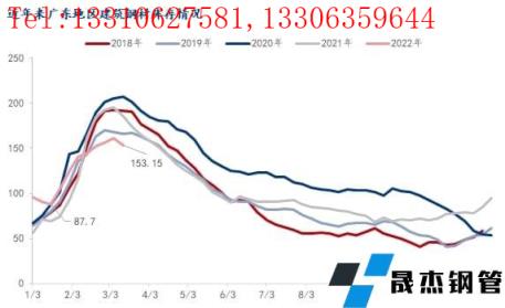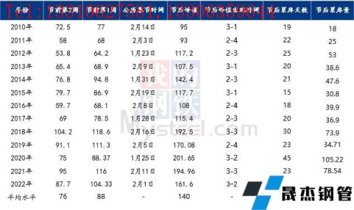 對比歷史數(shù)據(jù)來看,近10年來春節(jié)后廣州建筑厚壁無縫鋼管庫存峰值均出現(xiàn)第3-5周,累庫周期約24天左右;近5年來節(jié)后庫存累庫量明顯上升,節(jié)后峰值水平均超過150萬噸以上,而2017年之前節(jié)后庫存峰值均在140萬噸以內(nèi)。近年來,隨著經(jīng)濟發(fā)展以及供應擴張,春節(jié)前市場主動性冬儲積極性增加,整體的庫存量出現(xiàn)明顯上升; 雖然2022年節(jié)前價格偏高,但節(jié)前現(xiàn)貨價格上漲,帶動市場不少商家主動性囤貨、備貨,節(jié)前庫存總量并未出現(xiàn)明顯累庫現(xiàn)象。節(jié)后開市,在疫情等因素影響下,累庫速度遠低于去年,今年庫存呈現(xiàn)的特點是,累庫速度快,累庫量大,周期短等特點。同時再加上今年節(jié)后不少短流程企業(yè)并未完全恢復生產(chǎn),自然資源供應量有所減量,節(jié)后累庫低于往年,且今年峰值出現(xiàn)在3月第1周,第二周迎來庫存拐點。