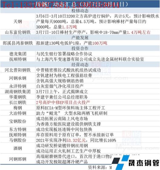 據(jù)不完全統(tǒng)計,本周(3月7日-3月11日)有2家無縫厚壁鋼管廠家發(fā)布檢修動態(tài),具體如下: