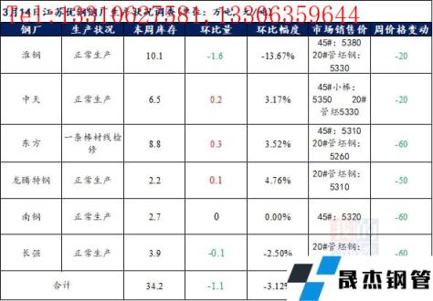 江蘇優(yōu)特無縫厚壁鋼管廠家棒材總庫存34.2萬噸,較上周下降1.1萬噸,環(huán)比降3.12%,較去年同期下降7.97萬噸,同比降18.9%,目前江蘇優(yōu)特無縫厚壁鋼管廠家除東方特鋼一條棒材線檢修外,其余無縫厚壁鋼管廠家正常生產(chǎn)。