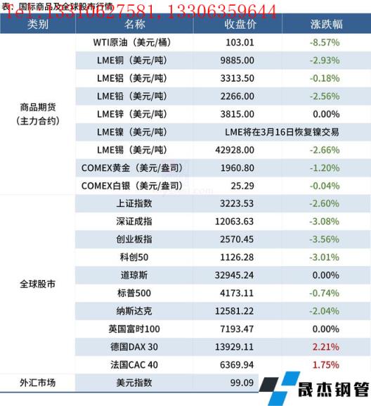◎ 倫敦金屬交易所(LME)稱(chēng)鎳合約將在當(dāng)?shù)貢r(shí)間3月16日恢復(fù)交易,并對(duì)所有金屬的每日價(jià)格波動(dòng)施加15%幅度的限制。