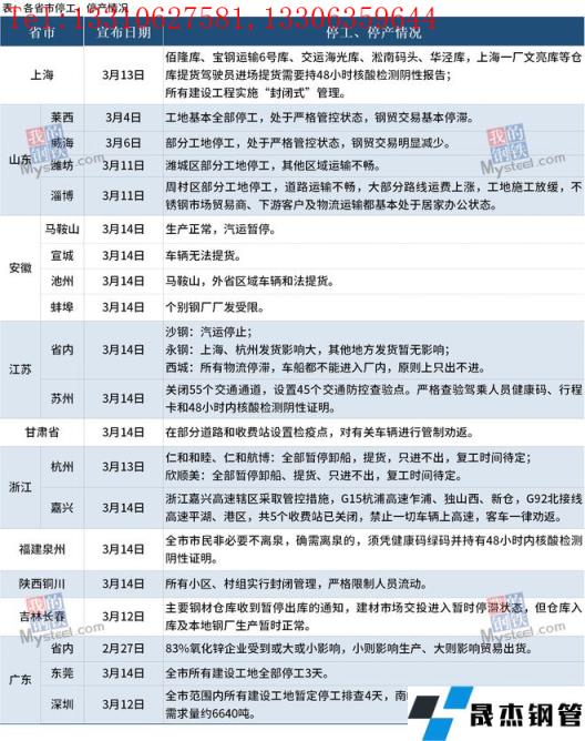 近期,全國疫情呈現(xiàn)局部高度聚集和多點(diǎn)散發(fā)態(tài)勢,對國內(nèi)大宗商品市場的供應(yīng)端、需求端、物流及倉儲等方面都有不同程度的影響。據(jù)統(tǒng)計,截至3月15日,全國多個省市發(fā)布停工停產(chǎn)情況。其中受疫情影響最大的吉林省于3月12日宣布,長春市主要厚壁無縫鋼管倉庫暫停出庫,當(dāng)?shù)亟ú氖袌鼋煌哆M(jìn)入暫時停滯狀態(tài),倉庫入庫及本地?zé)o縫厚壁鋼管廠家生產(chǎn)暫時正常。深圳市于3月12日宣布,全市范圍內(nèi)所有建設(shè)工地暫定停工排查4天,南山及福田區(qū)域厚壁無縫鋼管市場預(yù)計共影響需求量約6640噸。與此同時,全國其他地區(qū)鋼貿(mào)交易也受到影響,部分工地開始停工,物流運(yùn)輸暫停服務(wù)。具體情況如下: