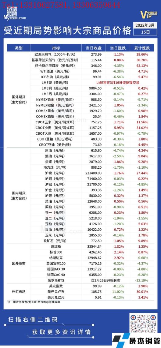 近期,受國(guó)際局勢(shì)影響,全球金融及大宗商品市場(chǎng)出現(xiàn)較大波動(dòng)。3月15日,國(guó)際能源價(jià)格繼續(xù)大跌,WTI原油與布油均降至100美元以下。匯總情況如下: