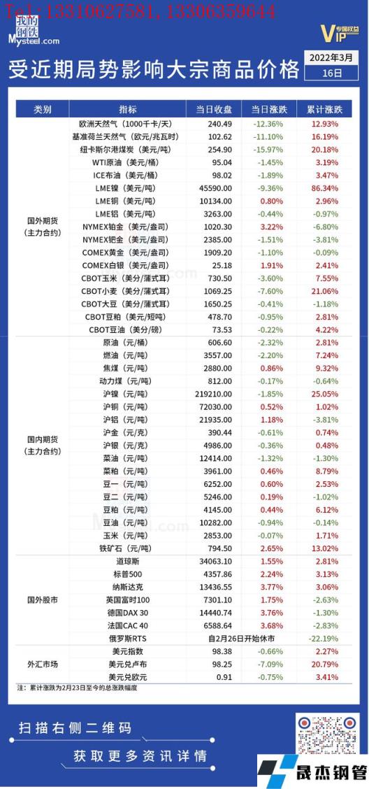 近期,受國際局勢影響,全球金融及大宗商品市場出現(xiàn)較大波動。據(jù)央視新聞報道,俄烏雙方準備好了一份在烏克蘭保持中立、裁軍的前提下實施的?;鸪奋娪媱潱瑖H能源價格繼續(xù)大跌。倫敦金屬交易所則宣布,將不會發(fā)布周三收盤價,因為鎳價在收盤價確定期間處于跌停狀態(tài)。跌停價45590美元/噸將繼續(xù)用于LME清算所的保證金計算,以及周四漲跌停的基礎。另外,美聯(lián)儲加息如期而至,美國三大股指跌宕起伏走出V型反彈。匯總情況如下: